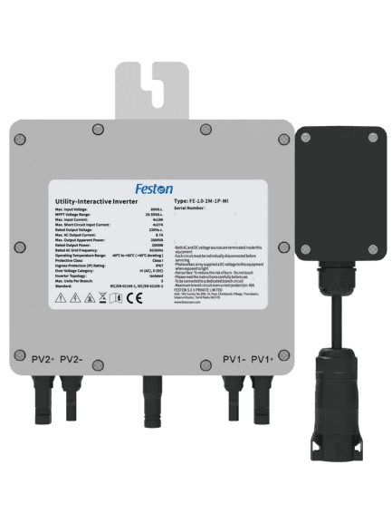 Feston FE-1-2M-1P-MI Microinverter – Compact, safe, and efficient. With dual MPPT, Wi-Fi monitoring, rapid shutdown, and IP67 protection, it delivers 1000W AC output while meeting IEC, DIN, VDE standards. Perfect for balcony or small solar setups.